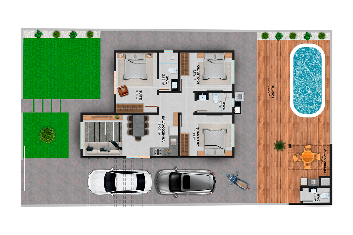 - Amplo espaço na frente com jardim completo e nos fundos piso porcelanato;